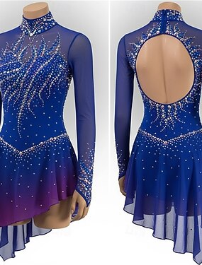 Robe de patinage artistique Femmes Patinage Robe Bleu Patchwork Dos Nu Haute Élasticité Entraînement Compétition Tenue de Patinage Classique cristal pailleté manche longue Patinage sur glace Patinage