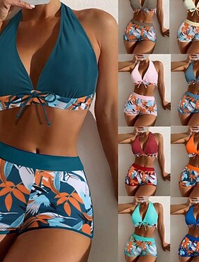 Femmes Maillots de Bain Bikini 2 pièces Shorts Maillot de bain Patchwork Dos nu Vacances Tenues de plage Fleuri Col Halter Sans manches Maillots de bain
