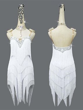 Robe de danse latine pour femme, blanche, à franges, strass, bretelles spaghetti, dos nu, costume de compétition de salsa, cha cha, rumba, samba