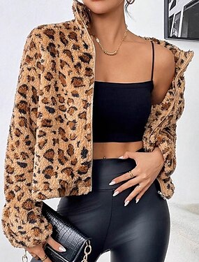 Veste double duveteuse Manteau d'hiver Femmes Top manche longue Épais Chaud Zip Up Léopard Extérieur Voyage Vacances Des sports Tenues de Sport Kaki