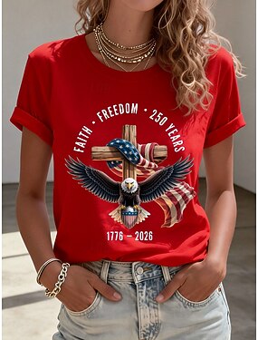 T-shirt pour femme patriote américaine pour le Jour de l'Indépendance Anniversaire Impression Graphique Drapeau Lettre Élégant Classique Décontracté Manches Courtes Col Ronde Hauts Quotidien Bleu
