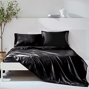 Parure de lit 4 pièces en satin de soie de luxe avec poche profonde et douce unie comprenant 1 drap plat, 1 drap-housse, 2 taies d'oreiller.