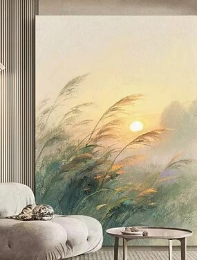 Peinture à l'huile sur toile, réalisée à la main, représentant un coucher de soleil parmi les roseaux. Décoration murale idéale pour le salon, l'entrée ou le hall d'entrée. Toile roulée, sans cadre ni