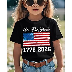 100% Coton Enfants Fille Noir Graphique Drapeau des États-Unis 250e anniversaire Drapeau américain pour enfant T-shirt Col Rond Manche Courte Vacances Sport & Loisir Tenue Quotidienne Hawaïen