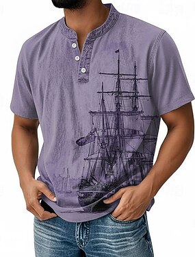 Homme Nautique Voilier T-shirt Chemise Henley Manche Courte Designer Rétro Vintage Tendance Occasionnel Quotidien Rue Été Printemps Toutes saisons Rose Dragée Pourpre Bleu Ciel Kaki Henley T-shirt