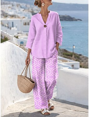 Ensembles deux pièces en lin pour femmes ensembles de pantalons top boléro manches 3/4 col en V graphique impression géométrique quotidien stylé décontracté quotidien violet vert beige printemps et