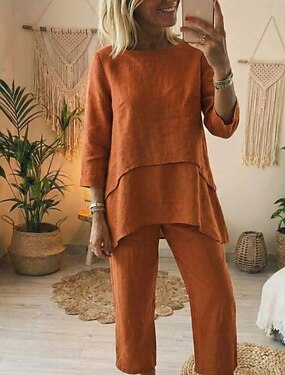 Femmes Chemise Chemises en coton et lin Ensemble de linge Ensemble 2 pièces Couleur Unie Mode Occasionnel Col rond Quotidien Rue Bleu Blanche Kaki Gris Été Printemps Automne Printemps & Automne