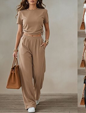 Femmes Ensembles deux pièces Manche Courte Col ras du cou Couleur Unie Noir Blanche Kaki Printemps & Été Coupe régulière