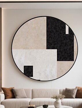 Peinture à l'huile abstraite circulaire faite à la main, division géométrique, surface texturée, art moderne, noir, blanc, beige, sable, taupe, palette, galerie, toile, contraste, équilibre, prête à