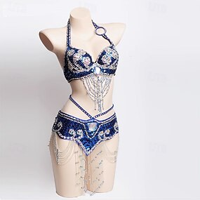 Samba Dancewear Ensemble de danse du ventre avec chaîne de perles à franges et gemmes bleu profond costume de performance