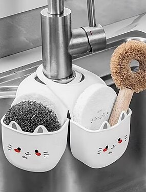 Lot de 2 supports de robinet en silicone en forme de chat mignon, avec trou d'évacuation. Gain de place, sans perçage, pour ranger éponges et brosses dans la salle de bain et l'évier de la cuisine.