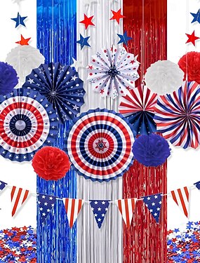Kit de décoration pour la fête du 4 juillet (14 pièces) : éventails en papier rouge, blanc et bleu, fanion drapeau américain, pompons, rideaux à franges métallisées, ruban étoilé, articles de fête