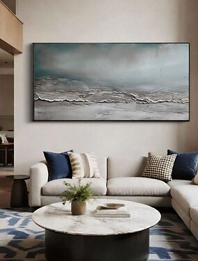 Tableau mural minimaliste en toile aux tons terreux, style wabi-sabi, avec texture 3D, évoquant l'océan et les plages côtières. Idéal pour une décoration de salon moderne.