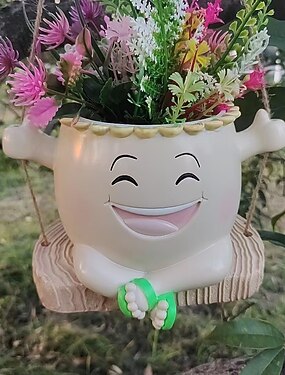 Grand pot de fleurs mural en résine représentant un visage souriant, au design fantaisiste et ludique, avec trous de drainage pour les plantes grasses. Pot décoratif d'intérieur/extérieur pour jardin