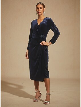 Fourreau Colonne Mi-long Robe de Cocktail Robe d'invité de mariage Robe Portefeuille Robe de Mère de Mariée manche longue Col carré Élégant Formel Semi-Formel Crêpe Extensible avec Perlage