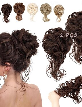 Lot de 2 chignons décoiffés avec mèches ondulées et bouclées, chouchous, extensions de queue de cheval, élastiques pour cheveux (brun moyen)