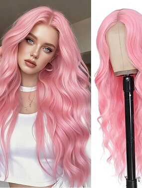 Perruque longue rose ondulée avec raie au milieu pour femme, 66 cm (26 pouces), rose clair, bouclée et ondulée, aspect naturel, en fibres synthétiques résistantes à la chaleur, idéale pour une