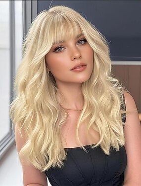 Perruques blondes pour femmes, perruque blonde avec frange, perruque longue ondulée et bouclée, perruque en fibre synthétique résistante à la chaleur, aspect naturel, idéale pour une utilisation