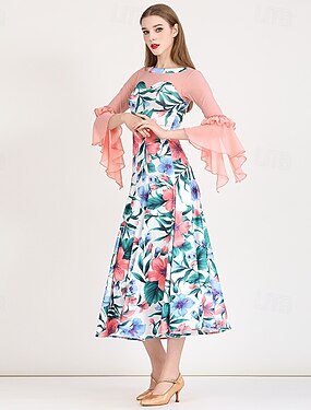 Danse de Salon Robe Dentelle Imprimé floral Plis Femmes Soirée Entraînement Performance manche longue Haut Nylon Élasthanne