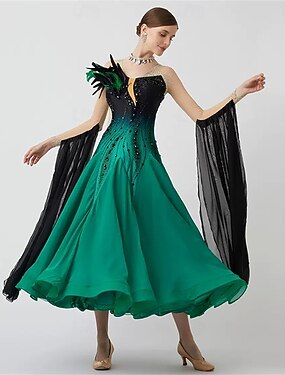 Robe de danse de salon pour femme, épaules en plumes, strass, dégradé, robe de compétition de valse et de tango, avec manches fluides en mousseline – vert et noir