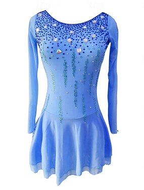 robe de patinage artistique femme fille robe de patinage sur glace bleu clair patchwork trou pour le pouce extensible entraînement pratique tenue de patinage professionnel cristal / strass manches