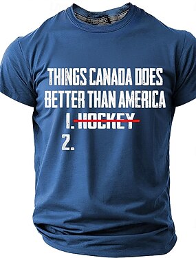 T-shirt graphique humoristique et sarcastique à manches courtes bleu marine, « Ce que le Canada fait mieux que l'Amérique : hockey barré », avec un message sur la fierté américaine. Tailles : S, M, L,