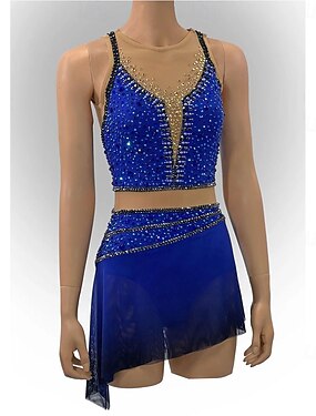 Robe de patinage artistique Femmes Patinage Robe Bleu Roi Patchwork Ourlet asymétrique Élastique Entraînement Compétition Tenue de Patinage Classique cristal pailleté Sans manches Patinage sur glace