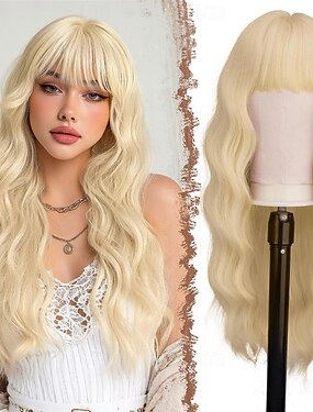 Perruques blondes pour femmes perruque blonde avec frange longues perruques bouclées ondulées aspect naturel perruque en fibres synthétiques résistantes à la chaleur pour une utilisation quotidienne