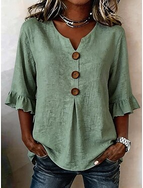 Femmes Chemisier A Volants Boutons Couleur Unie Élégant Basique Occasionnel Manche 3/4 Col en V Hauts Réguliers Quotidien Bleu Blanche bleu marine Vert Été Printemps Automne