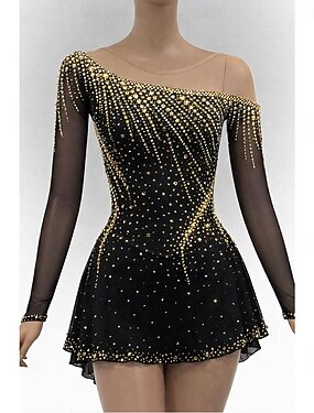 Robe de patinage artistique Femmes Patinage Robe Noir Patchwork Ourlet asymétrique Élastique Entraînement Compétition Tenue de Patinage Classique cristal pailleté manche longue Patinage sur glace