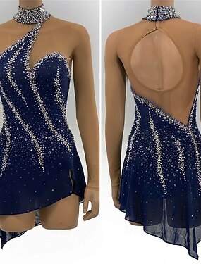 Robe de patinage artistique Femmes Patinage Robe Bleu marine Patchwork Dos Nu Élastique Entraînement Compétition Tenue de Patinage Classique cristal pailleté Sans manches Patinage sur glace Patinage
