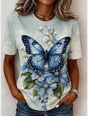 Femmes T-shirt Imprimé Fleuri Graphique Libellule Bohème Hawaïen Élégant Manche Courte Col ras du cou Hauts Réguliers Occasionnel Quotidien Bleu Jaune Rose Claire Violet Vert Été Printemps