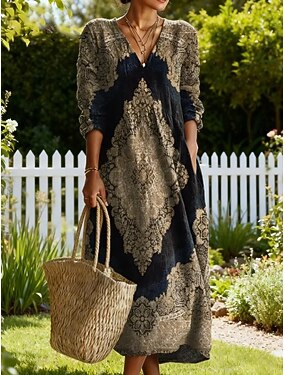 Femmes Robe maxi Robe Décontractée Robe évasée Robe trapèze Occasionnel Quotidien Coupe régulière Graphique Manche 3/4 Col en V Bleu Kaki Vert Véronèse Été Printemps Automne