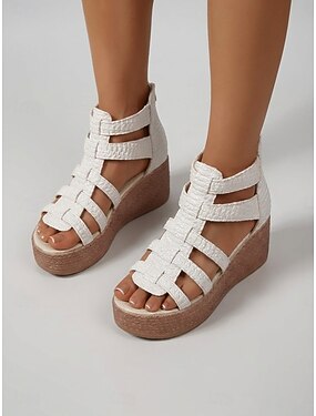 Sandales compensées romaines blanches de style gladiateur pour femme – design à brides ajourées, bride cheville avec fermeture éclair à l'arrière, chaussures d'été décontractées pour les vacances, la