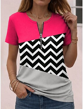 Femmes T-shirt Fermeture éclair Bloc de Couleur Graphique Géométrique Bloc de Couleur ancien Hawaïen Élégant Manche Courte Col ras du cou Hauts Réguliers Quotidien Sports Week-end Bleu Rose Claire