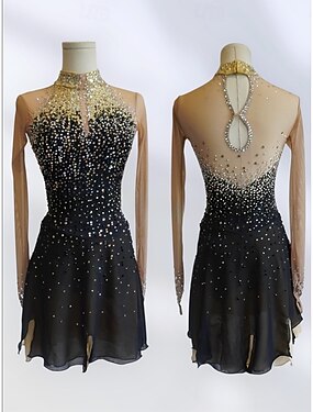 Robe de patinage artistique Femmes Fille Patinage Robe Noir Patchwork Dos Nu Maille Spandex Haute Élasticité Entraînement Compétition Tenue de Patinage Classique cristal pailleté manche longue