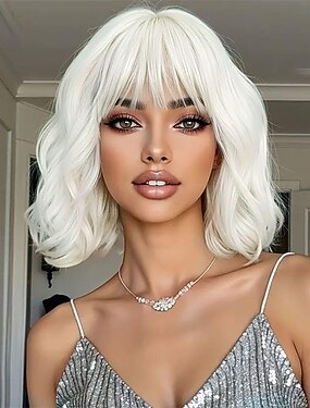 Perruque courte blanche avec frange, coupe au carré ondulée et bouclée, en cheveux synthétiques pour femmes. &les filles l'utilisent quotidiennement pour une soirée cosplay