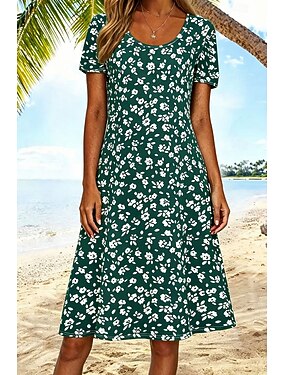 Femmes Robe Midi Robe trapèze Vacances Occasionnel Extérieur Sortir Coupe Standard Fleuri Manche Courte Col carré Vert Été Printemps