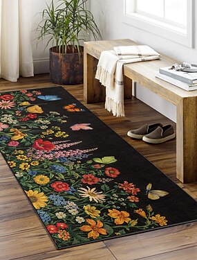 Tapis de couloir sur fond sombre avec fleurs et papillons colorés, long tapis décoratif pour entrée.