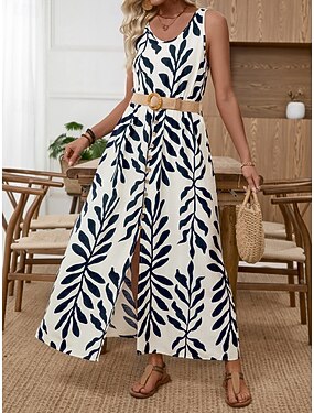 Femmes Robe maxi Robe trapèze Vacances Occasionnel Extérieur Sortir Coupe régulière Feuille Sans manches Col Rond Bleu marine Été Printemps