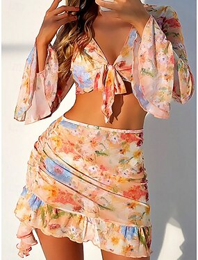 Maillot de bain bikini avec jupe pour femmes dos nu vacances plage graphique floral col en V manches longues