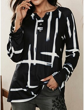 Femmes T-shirt Boutons Plaid Basique manche longue Manche flottante Col en V Hauts Longs Quotidien Sports Noir Blanche Rouge Automne Hiver
