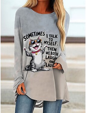 T-shirt femme à manches longues graphique animal chat vintage élégant classique col rond régulier hauts impression quotidienne gris printemps automne préautomne