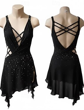 Robe de patinage artistique pour femmes et filles, noire, dos ouvert, ourlet asymétrique, maille, haute élasticité, entraînement, compétition, vêtements de patinage, classique, cristal/strass, manches