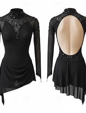 Robe de patinage artistique pour femmes et filles, noire, dos ouvert, ourlet asymétrique, maille, haute élasticité, entraînement, compétition, vêtements de patinage, classique, cristal/strass, manches