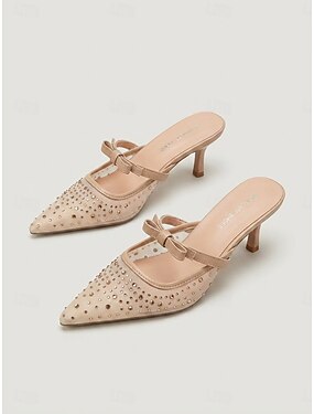 Mules à talons en résille ornée de strass couleur chair pour femme – élégantes chaussures à enfiler pour cocktail.