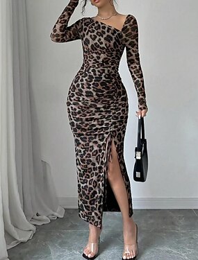 Femmes Robe Midi Robe fourreau Robe Imprimée Moderne Extérieur Vacances Fête Coupe régulière Léopard manche longue Col ras du cou Rouge Marron Kaki Automne Hiver
