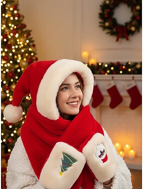 Ensemble écharpe et gants de Noël pour femme, design à capuche avec broderies du Père Noël et de l'arbre, accessoire d'hiver chaud pour les vacances