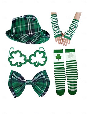 Chapeau à carreaux verts pour femme, lunettes à motif trèfle, gants, nœud papillon pour la Saint-Patrick &Ensemble de chaussettes rayées – accessoires festifs et amusants pour les célébrations de la