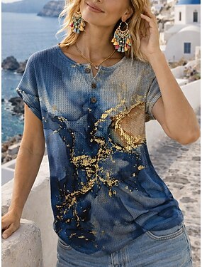 Femmes T-shirt Imprimé Boutons de poitrine Marbre Élégant Moderne Occasionnel Manche Courte Henley Hauts Réguliers Quotidien Bleu Été Printemps